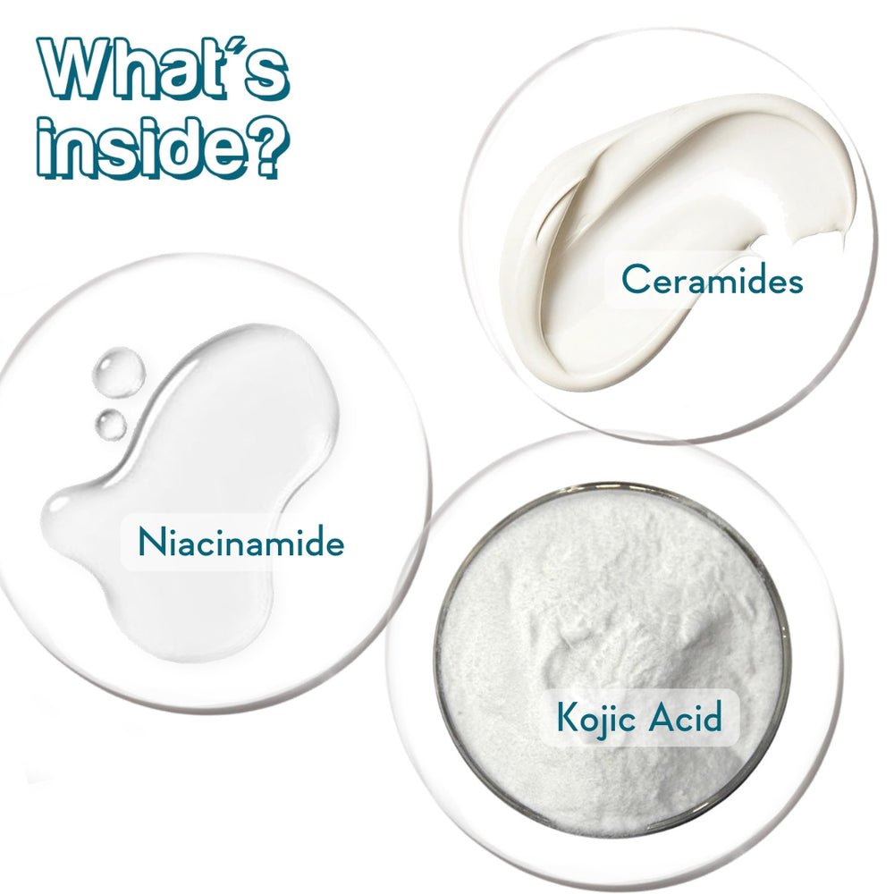 SPF50 Body Lotion : Aqua, Octocrylene, Octyl Salicylate, Glycerine, Glyceryl Monosterate, Cetyl Alcohol, Cetosteryl Alcohol, Emulsifying Wax, Acrylate Crosspolymer, Tinosorb-M, Olive Squalane, Black Sesame Seed Oil, Safflower Oil, Isopropyle Palmitate, Niacinamide, Green Tea Extract, Xanthum Gum, Hydroxyethyl Cellulose, Phenoxyethanol, Ethylhexyl Glycerin, Potassium Sorbate, Sodium Benzoate, Citric Acid. Underarm Roll-on : Aqua, Propylene Glycol, Glycerine, Glycolic Acid, Aloe Vera Extract, Witch Hazel Extract, Hydrogenated Castor Oil, Niacinamide, Hyaluronic Acid, Glutamic Acid, Mandelic Acid, Urea, D-Panthenol, Sucrose, Sorbitol, Squalene, Allantoin, Kojic Acid, Licorice Extract, Centella Asiatica (CICA) extract, Allergen Free Fragrance, Ethylhexylglycerine